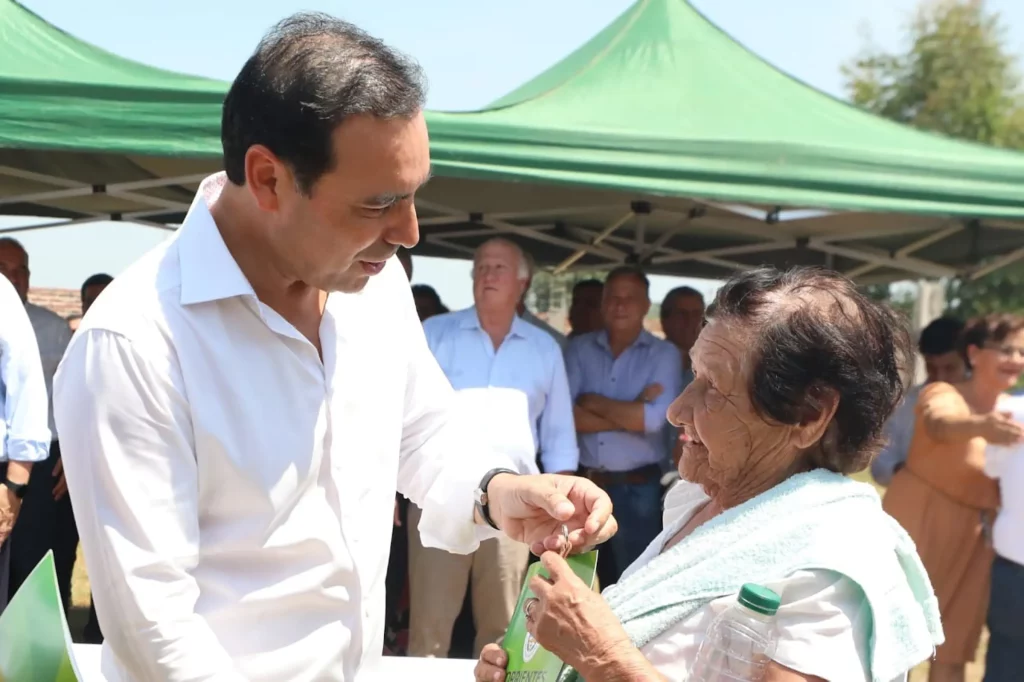 El gobernador Gustavo Valdés, este miércoles en Saladas, junto al intendente local Noel Gómez, entregó 15 viviendas bajo el Programa Oñondivé en el barrio San Benito, y habilitó 1.400 metros de Costanera que bordea la Laguna Soto. En la oportunidad, el Mandatario se comprometió a construir “20 viviendas más de demanda libre”.
